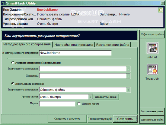 Затем мы выбираем, как осуществлять backup. Можно копировать все файлы, а можно и использовать архивирование, в том числе и с паролем. Для работы используется архиватор 7Zip, в последнее время все более популярный. Кроме выбора метода копирования, можно и выбрать, куда оно будет производиться. По-умолчанию это флэшка, хотя для больших объемов информации можно использовать и какой-либо из разделов жесткого диска (или ВЖД), применяя MUS-1001 как инициатора процедуры. Кстати, используя «Продвинутые опции» при работе с архивированием можно настроить разбиение полученного файла на части, размером с CD или DVD — удобно для задания, изредка выполняющего резервное копирование всего содержимого винчестера с последующей записью полученного многотомного архива на оптические диски. Можно также и время выполнения заданий настроить, дабы не забыть о них. Можно и вручную запускать.