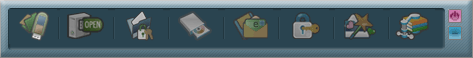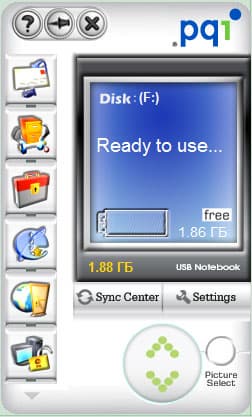 Основное окно программы представляет собой кнопочную панель, способную располагаться поверх всех окон на экране (это можно и отключить). Восемь больших квадратных кнопок осуществляют доступ к функциям приложения, а две маленькие в правой части позволяют свернуть его в системную область панели задач или закрыть. Свернутую программу можно оставить висеть в памяти и при отключении накопителя — в этом случае при его подключении она радостно известит вас об этом событии и автоматически запустится. Изучение кнопок будем проводить слева направо.
