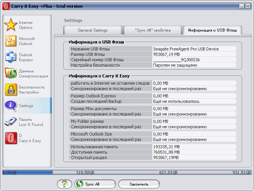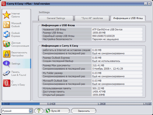 Последняя закладка этой группы выдает нам массу различной информации. Программа «знает» огромное число флэшек, так что может выдать их название и даже серийный номер. И, разумеется, в этом окне мы увидим подробный отчет программы о самой себе: какие функции задействованы? Сколько на каждую из них ушло «дискового» пространства? Когда выполнялась последняя синхронизация и т. п.