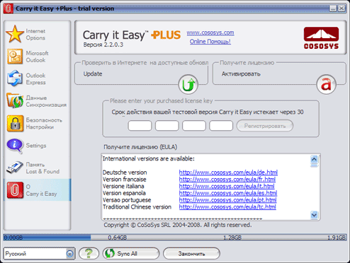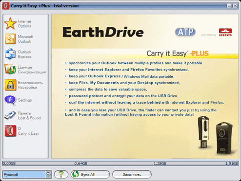Что касается дополнительной функциональности, то производитель записал на накопитель программу Carry it Easy Plus от компании CoSoSys SRL. Сперва мы очень обрадовались факту наличия в комплекте не самой дешевой утилиты (ее цена составляет 24,95 евро), однако оказалось, что халявы не будет — ключик к программе в комплект не входит. Так что она проработает лишь положенные 30 дней в ознакомительном режиме, а дальше — либо плати, либо отказывайся от ее применения. Впрочем, платить придется меньше, чем «человеку со стороны», — регистрация версии для АТР стоит 14,95 евро, так что скидка весьма внушительная. А программа действительно весьма удобна и полезна, так что мы рассмотрим ее подробнее.