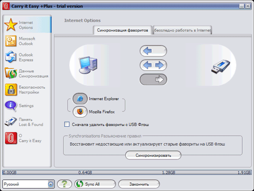 Как почтовые базы, избранное и файлы документов попадают на накопитель? Для этого предназначена небольшая кнопочка «Sync Center». Как и следовало ожидать, она открывает «Центр синхронизации». Последний позволяет осуществлять как односторонние операции (перенос информации с компьютера на накопитель или обратно), так и обеспечивать полноценную синхронизацию. Увы, но возможности программы несколько бедноваты по сравнению с утилитой от CoSoSys. Во-первых, несложно заметить, что синхронизация файлов данных ограничена всего одной папкой компьютера — собирать информацию из разных папок программа не умеет. Во-вторых, вся синхронизируемая информация хранится на накопителе в открытом виде — для шифрования с файлами приходится работать вручную. В-третьих, операции синхронизации выполняются исключительно вручную — никакого планировщика здесь нет.