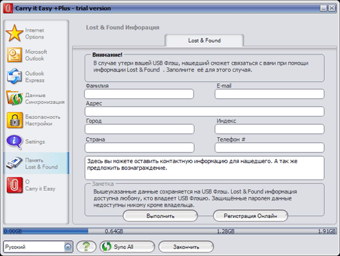 Флэшки, как и прочие мелкие вещи, часто теряются. Чтобы никто не рылся в ваших файлах данных, утилита поддерживает шифрование информации. Но на этом ее забота о пользователе не заканчивается. Ведь часто бывает так, что человек, нашедший накопитель, с удовольствием вернул бы его владельцу, но… Кому? Куда? Все флэшки одинаковые, «выудить» с них информацию о владельце иногда можно, конечно, но это надо рыться в файлах в поисках той самой «приватной» информации, которую желательно бы скрыть. Прямо хоть бумажку по типу багажного ярлычка приклеивай. Cary it Easy позволяет обеспечить альтернативный вариант — хранение контактной информации в самой программе. Может быть, что это позволит вам вернуть себе утерянный накопитель.