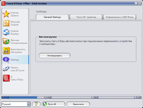 Посмотрим, что у нас с настройками. Первая страничка посвящена возможности автозапуска утилиты при подключении накопителя к компьютеру.