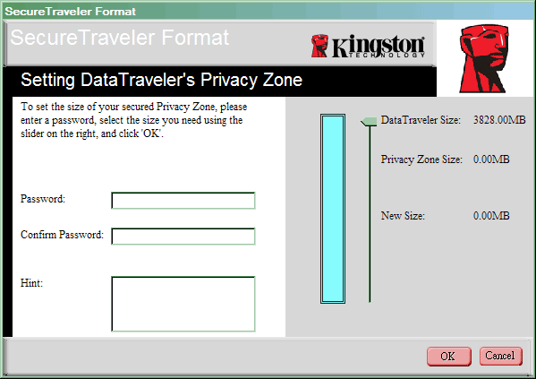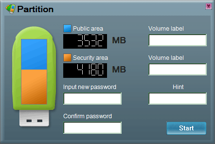 Первая кнопка позволяет разбить накопитель на открытую и защищенную паролем часть. Эта функция присуща очень многим накопителям, хотя ее реализация вызывает нарекания у части пользователей — одновременный доступ к обеим частям невозможен. А так, все стандартно: мышкой распределяем свободный объем, вводим пароль, его подтверждение и подсказку, при желании, можем присвоить метки тома обеим частям. И все. Информация, хранимая на накопителе, разумеется, при этом пропадет.