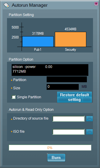 Но следующая функция крайне интересна. Она не делает флэшку автозапускаемой, как может показаться из названия, — она «откусывает» от накопителя часть пространства, на которой эмулирует USB CD-ROM, которому, разумеется, автозапуск присущ. Его можно создать самому на базе папки с файлами, а можно и взять готовый образ. Год назад такая функциональность была менее интересной, поскольку объем тогдашних накопителей был небольшим, а сейчас есть, где развернуться. Заметим, что эмуляция полная — с подобного «компакт-диска» можно и компьютер загрузить, так что это мечта тех, кто подрабатывает на жизнь «лечением» чужих компьютеров: делаем образ какого-нибудь CD или DVD серии «Реаниматор» или самосборного, записываем на флэшку и — вперед. Причем удалить такой раздел можно только комплектной утилитой и только при помощи «Autorun Manager» — «Partition» его не видит, а для сторонних утилит — это совершенно отдельный накопитель.