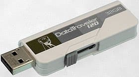 А это «просто флэшка», каких у компании достаточно много. Дизайн — один из самых простых без колпачка, но с сохранением стандартного «полноразмерного» USB-разъема А-типа. Размеры — 58,8×23,6×9,5 мм. Емкость — 8-32 ГБ. Скорость — про нее скромно умалчивают, но поводов для оптимизма никаких, поскольку накопитель даже не поддерживает ReadyBoost. Программного обеспечения в принципе никакого — ни на самой флэшке, ни на сайте. Дополнительных аксессуаров в комплекте тоже нет. В общем, типовой массовый накопитель, коим на рынке никого не удивишь. Положительно можно оценить разве что цветовую дифференциацию устройств в зависимости от емкости, хотя разноцветность «нашлепки» на лицевой стороне и выдвигающей разъем «пимпы» на боку в глаза особо и не бросается; корпус же всегда белый. Особенностью устройства является его участие в программе «Cologo», которая не очень интересна одиночному пользователю, но способна оказаться крайне полезной для компаний (пусть даже и небольших). Сущность ее заключается в том, что вы можете подготовить свой логотип или просто картинку в положенном формате, отправить ее в Kingston и получить партию накопителей, сделанных именно для вас. Минимальный размер партии — всего 100 устройств. А поле для деятельности открывается достаточно просторное. Например, презентовать партнерам компании на какой-нибудь из праздников по флэшке с собственным логотипом — оригинальный и приятный подарок :) Или обеспечить выпуск накопителей с какими-нибудь местными картинками — удобно для магазинов, расположенных в туристических районах. В общем, возможность достаточно интересная и практически полезная, но далеко не для всех.