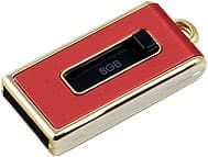 Подобно первому, данный накопитель в первую очередь предназначен тем, кто в флэшдрайве ценит компактность, однако отличием является то, что здесь она не принесена в ущерб внешнему виду. Корпус устройства-слайдера в транспортировочном состоянии имеет размеры всего лишь 28,5 х 15 х 5 мм и массу 4 грамма, однако внутри при этом скрывается от 4 до 32 ГБ флэш-памяти (мы тестировали модификацию на 8 ГБ). Лицевая поверхность раскрашена в один из трех цветов — наряду с показанным на фотографиях карминово-красным, есть также накопители золотистого и черного цветов, ну а боковины и петелька для ношения всегда выкрашены в золото. В общем, выглядит флэшка весьма богато и нарядно, так что интересоваться программным обеспечением или скоростью работы как-то и неприлично. Программ в комплекте, действительно, никаких нет, а насчет скорости сказано лишь, что накопитель поддерживает ReadyBoost (что выполняется и для двух описанных выше моделей компании). В общем, двумя словами, это маленький и красивый флэшдрайв. Похожий на Super Stick mini внутри, но заключенный в красочный корпус.