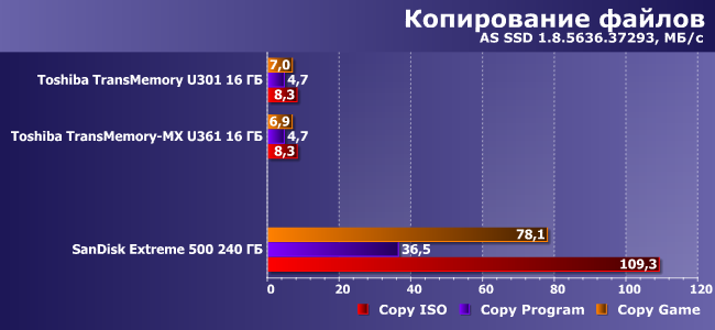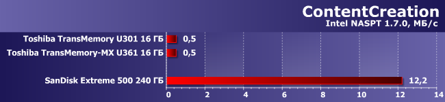 Причем если речь идет просто о файлах данных, с которыми нужно серьезно поработать, все равно имеет смысл скопировать таковые на компьютер (даже если потом их оставлять на нем не требуется), а не пытаться что-то делать «по месту». Просто потому, что даже раскритикованный нами в прошлый раз SSD SanDisk Extreme 500 с подобной работой справляется в 25 раз лучше. О внутренних же накопителях и говорить нечего. Флэшки в такой ситуации унылы чуть более, чем полностью. Друг от друга, как и предполагалось, не отличаются.