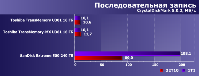 Данный сегмент рынка, как уже было сказано выше, давно стал жертвой борьбы за низкие цены. Но результат, впрочем, покупателей вполне устраивает: в конце концов, записывать «в один прием» десятки гигабайт информации требуется редко. По большому счету, покупатели спокойно продолжали бы пользоваться флэшками на 2-4 ГБ — просто в результате все той же борьбы за себестоимость выпускать чипы низкой емкости не имеет смысла. Вот потому минимальная емкость флэш-драйвов уже «доросла» до 16 ГБ и больше. Есть, конечно, в продаже и старые модели меньшего объема, однако стоят они обычно не пропорционально дешевле, а иногда и столько же. И работают с той же скоростью, которая вот уже лет 10 большинство устраивает — а меньшинству просто нужно приобретать накопители несколько другого класса и заранее готовиться к более высоким ценам. Разумеется, цены на них выше только в абсолютном исчислении, поскольку по стоимости хранения гигабайта информации тот же SanDisk Extreme 500 240 ГБ примерно эквивалентен Toshiba TransMemory-MX U361 16 ГБ. В чем же подвох? В том, что емкость этих устройств и, соответственно, итоговая цена отличается в 15 раз, что принципиально меняет отношение к ним и покупателей, и производителя. Массовый флэш-драйв просто давно уже занял ту нишу, в которой когда-то обитали дискеты: дешево, достаточно емко для удовлетворения основных потребностей пользователей, универсально... ну а скорость работы просто не имеет значения ни для кого, кроме исследователей :)