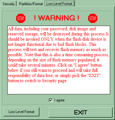 Третья закладка полезна в том случае, если вы забыли пароль и хотите вернуть накопитель в строй (пусть ценой потери всех данных) или в тех случаях, когда флэшдрайв начал работать с ошибками. Вообще, возможность низкоуровневого форматирования в домашних условиях вещь зело полезная — не бежать же в сервис после каждого сбоя файловой системы :) Но и достаточно опасная (теряется вся информация, в том числе и защищенная паролем), так что большую часть закладки занимает серьезное предупреждение, а кнопка, запускающая форматирование недоступна пока вы не поставите галочку в нужном месте.
