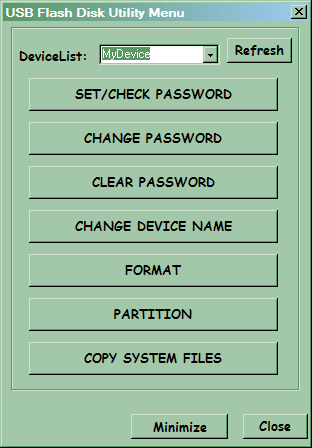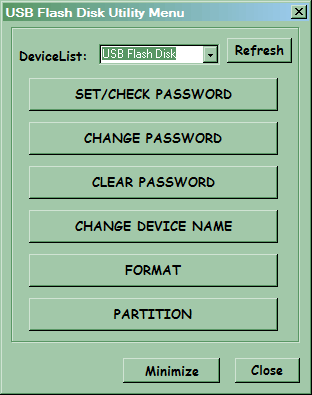 Очень удобен и встроенный форматер. В случае, если накопитель разбит на части, появляется выбор, какую из них форматировать (или обе сразу можно). Вот, практически и все. Второй и третий пункты меню предназначены для изменения и удаления пароля, а четвертый — для изменения имени устройства по-умолчанию (поскольку ПО способно работать сразу с несколькими однотипными накопителями, разные имена для них не прихоть, а необходимость).