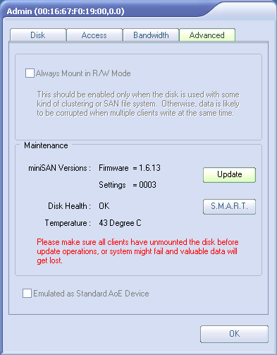 Интересно, что при работе через Wi-Fi (например, с ноутбука), устройство видится не как miniSAN, а как AoE (ATA-over-Ethernet) с несколько меньшими возможностями по управлению. Однако из-за существенно меньшей скорости беспроводного подключения мы не рекомендуем использовать данное устройство с ним.