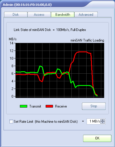 Напомним, что данный тип подключения подразумевает, что операционная система видит диск как локальный. Что означает необходимость его разбиения на разделы и форматирования. Второй, более важной особенностью, является то, что в каждый момент времени доступ на запись к диску может иметь только один клиент. Только это может обеспечить сохранность данных файловой системы при одновременном доступе с нескольких компьютеров. В обычной конфигурации это определяется порядком подключения диска — кто первый подключился, тот и получил полные права. Тип подключения отображается цветом шарика около имени диска. Зеленый означает полный доступ, а синий — только чтение. Узнать, какой компьютер имеет полные права, можно наведя мышку на иконку диска в программе управления. Безусловно, эта особенность несколько ограничивает возможности использования устройства как сетевого диска. Например, усложняет работу программ резервного копирования. Особенно учитывая то, что при отключении первого клиента, второй не изменяет свои права автоматически.