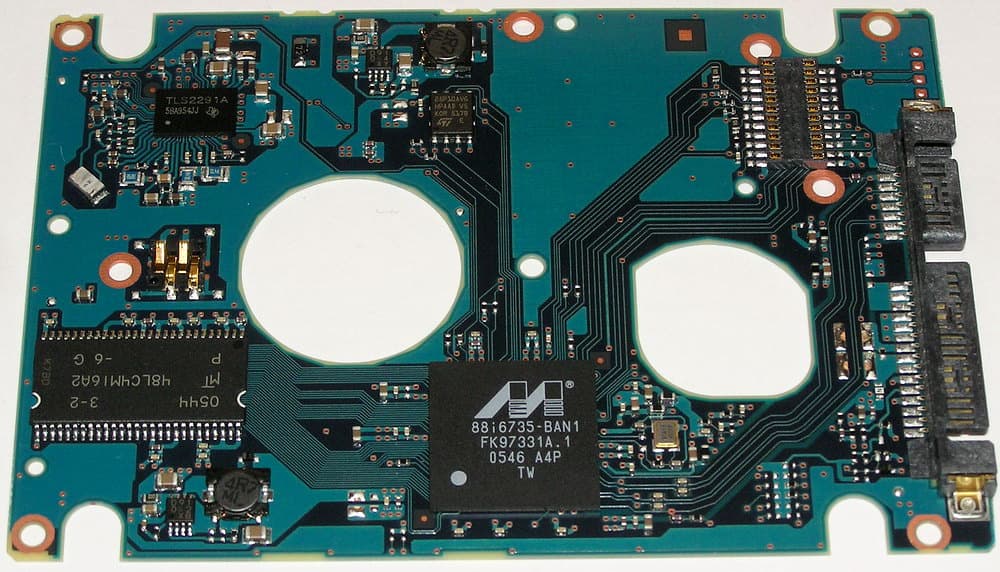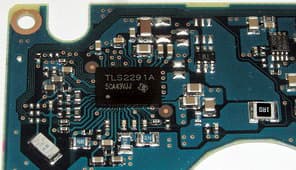 а к драйверу моторов подключен датчик ускорения (вибраций). Рядом с ним — мощный импульсный стабилизатор напряжения, управляемый от основного контроллера. Кстати, печатные платы у контроллеров таких дисков очень тонкие — всего 0,6 мм в толщину (с маской), хотя при этом и многослойные — как минимум, три слоя металлизации.