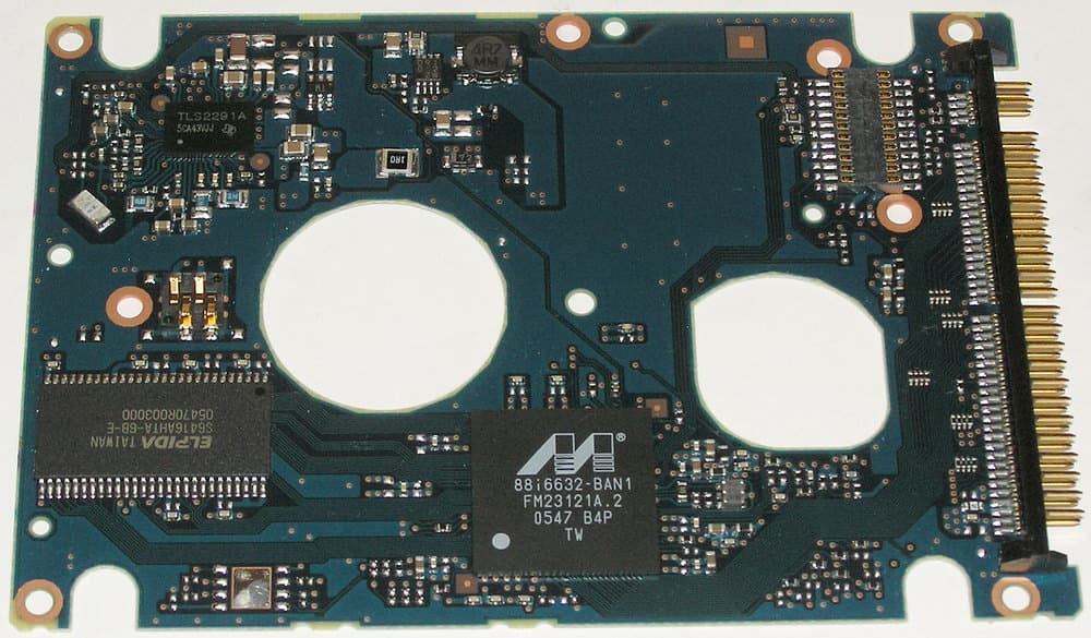 С обратной стороны диски Fujitsu этой серии с разными интерфейсами очень похожи и, как и остальные 2,5-дюймовые диски данного производителя, используют печатную плату на всю заднюю поверхность диска за исключением вырезов под выступы для моторов и креплений.