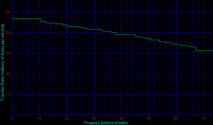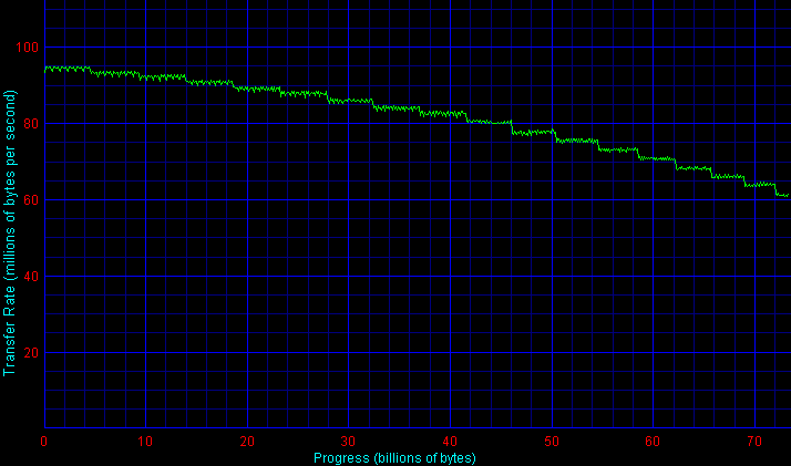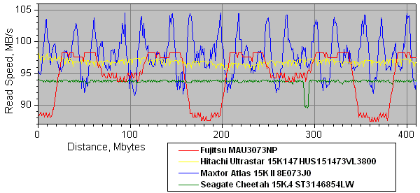 На графике для Fujitsu MAU3073NP четкая периодичность колебаний скорости линейного чтения с очевидностью означает, что разные поверхности магнитных пластин этого диска отформатированы с разной линейной плотностью записи, отличающейся друг от друга до 13% по абсолютной величине! Головок у данного диска четыре, соответственно, и число «полок» на графике (которые в данном случае выражены весьма четко) должно быть кратно четырем в каждом «периоде колебаний» графика — 12 полок здесь налицо. С одной стороны, использование адаптивного форматирования — это явный скоростной плюс данных накопителей, но с другой — диски даже из одной партии могут заметно различаться по скорости линейного чтения, что дает некоторый разброс производительности даже внутри одной модели дисков.