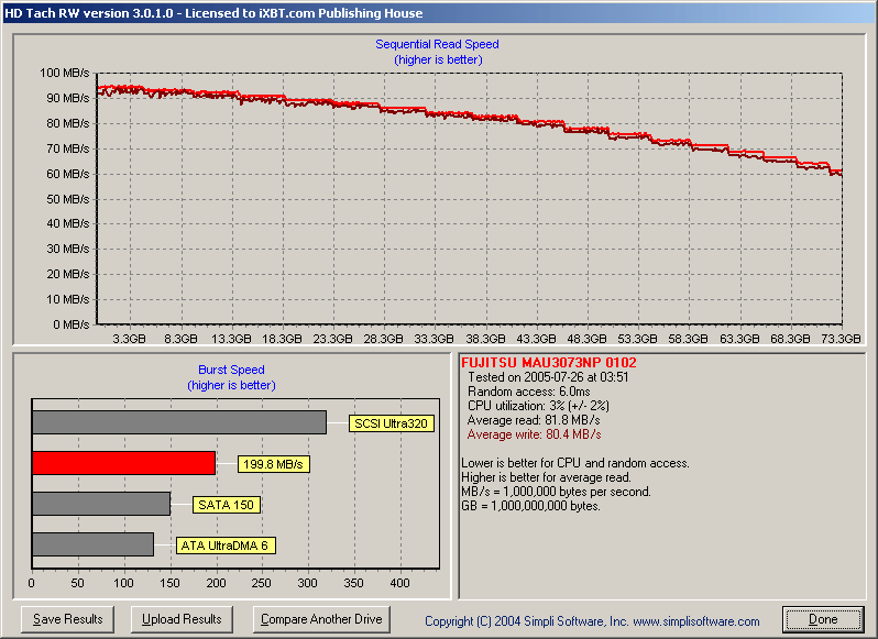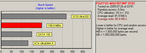Дисковый тест популярного PCMark04 вновь продемонстрировал, что «настольная» производительность накопителя Fujitsu очень высока — его результаты в этом тесте выше не только, чем у великолепного Maxtor, но и намного выше, чем у самых современных ATA-дисков.