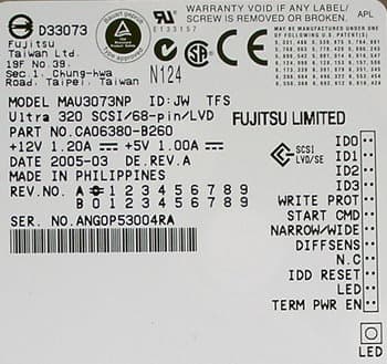 Маркировка диска Fujitsu MAU3073NP с интерфейсом WIDE 68 pin, использованного в наших испытаниях, показана на фото.