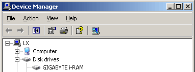 Эти два процесса, в принципе, не сложнее, чем установка обычного жесткого магнитного диска: вставляем, закрепляем винтами, подключаем SATA-кабель и включаем питание компьютера. Во время начальной загрузки ПК BIOS материнской платы (SATA-контроллера) определяет Gigabyte i-RAM как обычный винчестер с таким же именем и емкостью, равной емкости установленных в RAMDISK модулей памяти (за исключением случая использования i-RAM в RAID-массиве). После чего с диском можно работать как с обычным винчестером под всеми операционными системами, его можно разбивать и форматировать штатными средствами ОС (например, fdisk и format) и так далее. Например, под Windows XP i-RAM определяется как стандартный дисковый накопитель
