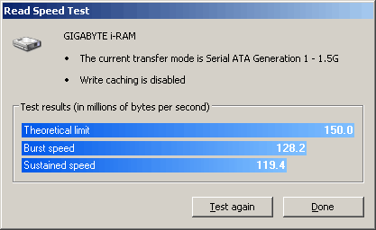включая при этом «виндовое» кэширование записи (понятно, что встроенного буфера для кэширования данных, как в обычном винчестере, здесь быть не может, поскольку i-RAM фактически целиком сам является таким буфером :)).