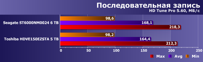 Одинаковые по плотности пластины одинакового диаметра, вращающиеся с одинаковой скоростью, неизбежно дают практически идентичный результат: порядка 220 МБ/с на внешних дорожках и лишь в районе 100 МБ/с на более коротких внутренних. Как видите, если твердотельные накопители уже «уперлись» в ограничения SATA600, то винчестерам все еще более чем достаточно SATA300.