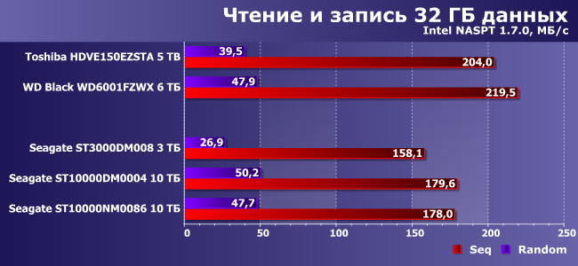 А время доступа дает намек на то, почему BarraCuda на 3 ТБ в тестах высокого уровня оказалась явным аутсайдером — задержки максимальные; особенно при записи. С другой стороны, BarraCuda Pro тоже не лидер, а Enterprise Capacity низкая латентность никак не помогает. Это как раз то, о чем мы предупреждали выше — современные винчестеры стали настолько сложными, что по одним лишь тестам низкого уровня уже невозможно предугадать: как они будут вести себя в сложных сценариях. Значение имеют уже и электроника, и даже прошивки — иногда определяющее. С другой стороны, принципиально положение дел они все равно не меняют: который год все винчестеры одного класса и по производительности выглядят сходным образом.