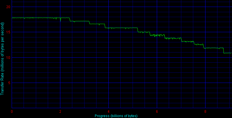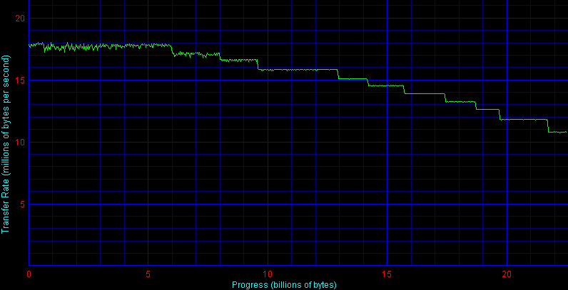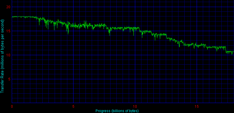 Здесь уже размер буфера особой роли не играет, поэтому лидерство Quantum вполне закономерно. Я довольно долго думал, чем объяснить такую разницу в результатах однотипных моделей от WD. Потом взглянул еще раз на график, и, кажется, понял. При малых размерах блока присутствие таких провалов в скорости чтения, как у WDC AC418000, может существенно повлиять на результат, что, по-видимому, и произошло. Отсюда же, видимо, и повышенная загрузка процессора.