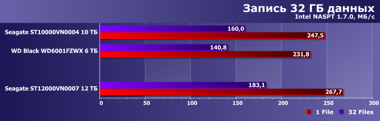 Тут тоже практически ничего не изменилось — разве что компания улучшила работу накопителей с парой потоков данных: ранее фактически все продукты Seagate при записи одновременно с чтением проигрывали устройствам WD, а теперь выигрывают. Но даже в этом сценарии прирост производительности лишь сравним с увеличением емкости, а в остальных — заметно ниже такового.