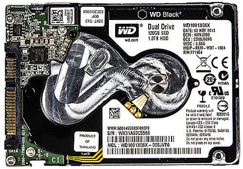Чтобы не тянуть с интригой, мы сразу раскроем формулу устройства. Почему Blue? Потому что требовалось упаковать в стандартный корпус (высотой 9,5 мм) и механику, и дополнительную электронику, так что первая должна быть максимально компактной. Идеальным было бы использование одной терабайтной пластины, но пока такую плотность записи производители в массовых продуктах не освоили, поэтому здесь установлены две полутерабайтных. А для компактности механики пришлось отказаться от скорости вращения 7200 об/мин, присущей серии Black, и ограничиться 5400 об/мин. Ничего не напоминает? Именно! Дисковая часть устройства аналогична уже известному нам WD Blue WD10JPVT. Изменений всего два, но оба относятся к электронике: во-первых, устройство получило интерфейс SATA600 (по сути, «в нагрузку» — пригодиться он может лишь SSD-части), а во-вторых, емкость кэш-памяти увеличилась с 8 до 16 МБ (столько было и в Black). В общем, в этом плане ничего нового и интересного.