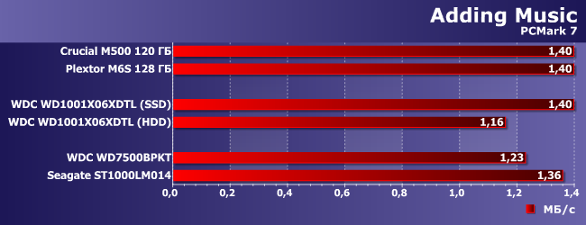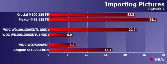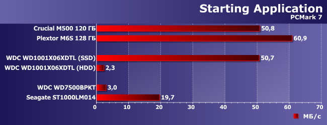 С другой стороны, глядя на эту диаграмму (и даже не глядя), данные по возможности тоже хочется переместить на SSD, поскольку их отрыв от винчестеров — те же три раза. Хотя тест в основном выполняет запись, неплохо показывает себя в нем и гибридный винчестер (поскольку активно обновляется база с информацией о картинках, а она весьма эффективно закэшируется), где мук выбора «куда писать» нет. Кстати, заметим, что тут и твердотельные накопители сильно различаются по производительности, так что Black² способен на конкуренцию лишь с бюджетным М500 на 120 ГБ. Впрочем, мы это предполагали изначально.
