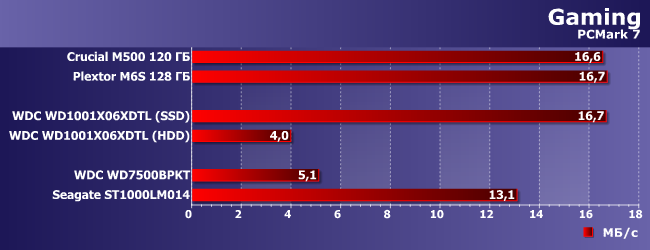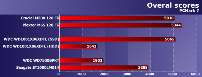 Использовать низкоуровневые тесты мы сегодня не стали: априори известно, как работает такой SSD (тестировали аналогичную модель), да и с винчестерной частью вопросов нет (Blue, да еще и ранее протестированный). Поэтому решено было ограничиться PCMark 7. Естественно, это синтетика, но куда более приближенная к реальности, нежели бенчмарки низкоуровневых характеристик. Заодно посмотрим, что́ в случае использования Black² следует устанавливать на SSD, а что́ — на HDD. И сравним в одинаковых условиях разные накопители. Цвета SSD будут защищать Crucial M500 120 ГБ (аналогичный флэш, такая же емкость, бюджетный сегмент) и Plextor M6S 128 ГБ (более быстрая модель). Со стороны винчестеров же участие принимают старший WD Black WD7500BPKT (по сути, именно его Black² заменяет на вершине горы) и «гибридный» терабайтник Seagate ST1000LM014.