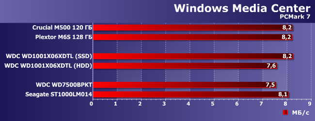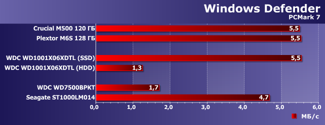 Все три твердотельных накопителя справляются с этой трассой одинаково. «Гибрид» отстал от них незначительно, но это в тестах — а в жизни далеко не все проверяемые антивирусом данные можно будет «найти» во флэш-кэше, так что производительность упадет до уровня обычных винчестеров, что раза этак в три медленнее. Разумеется, Black² как винчестер ничем от других не отличается. Словом, желательно держать на SSD-части все, что имеет смысл проверять антивирусом, а винчестерную использовать только для хранения данных. Неожиданно, не правда ли? :)