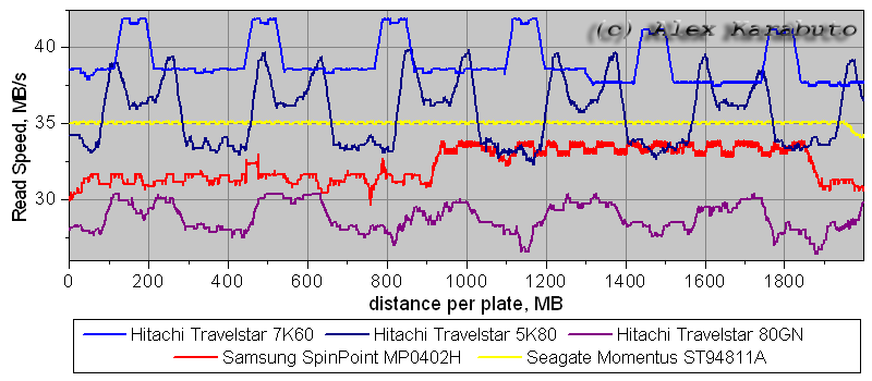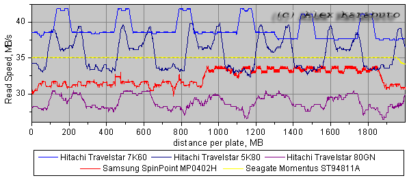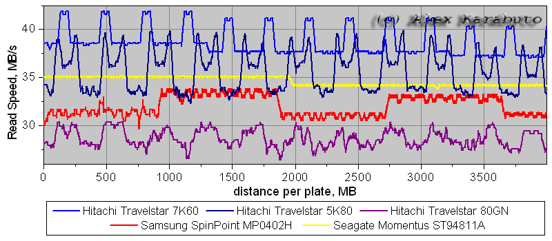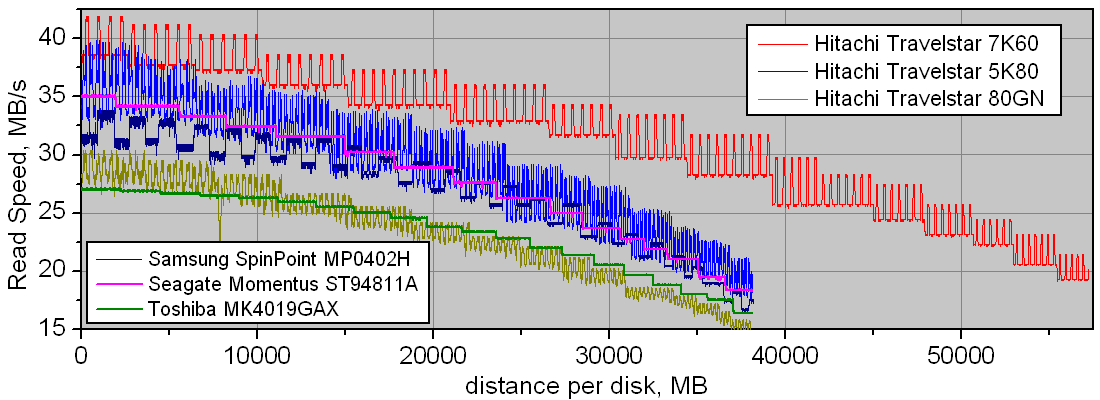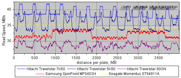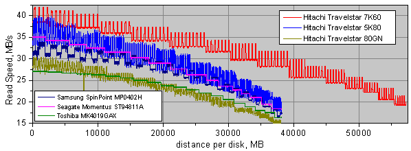 Зубчатый график скорости чтения у этого диска вместо привычного гладкого объясняется применением фирменной технологии адаптивного форматирования. Напомню, что адаптивное форматирование применяется пока только в мобильных накопителях Hitachi — дисках серий Travelstar 80GN, 5K80 и 7K60/E7K60 (представители всех трех присутствуют в данном обзоре и на этом сводном графике).