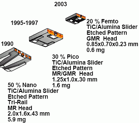 Среди интересных новаторских технологий, которые применяются в этих жестких дисках, стоит отметить, прежде всего, фемто-слайдеры, на которых, собственно, и находятся магнитные головки. Фемто-слайдеры впервые появились именно в 7K60/E7K60 и пришли на смену пико-слайдерам (см. рисунок).