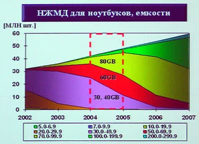 Примерно то же самое можно сказать и о емкости мобильных накопителей, которая также неуклонно растет — в нынешнем году наиболее востребованные емкости — 40, 60 и 80 Гбайт, дальше — больше (см. слайд). Видимо, поэтому Hitachi посчитала ненужным делать «мелкие» модели своего семитысячника и в серии 7K60 оставила только одну модель — емкостью 60 Гбайт (а в упрощенной серии E7K60 оставила еще и 40-гигабайтную модель).