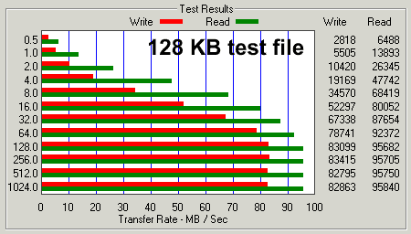 Другим показательным тестом «внутреннего устройства» дисков является тест на скорость чтения и записи файлов различного объема блоками разного размера — от 512 байт до 1 Мбайт. Для этого я традиционно использую тест ATTO Disk Benchmark. На скриншотах ниже показаны результаты для четырех размеров тестового файла — 128 Кбайт, 1 Мбайт, 4 Мбайт и 32 Мбайт. Если первый и второй, как правило, гарантированно кэшируются буфером диска (причем, кэширование записи и чтения для мегабайтного файла не так однозначно), то последний просто в него «не влезает», а кэширование предпоследнего зависит не только от объема буфера, но и от специфики работы firmware накопителя (кстати, результаты данного теста практически не зависят от выбора между FAT и NTFS).