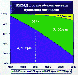 Например, по данным аналитической компании IDC, мобильные накопители со скоростью вращений 5400 об./мин. в этом году займут более 30% от всех поставок 2,5-дюймовых жестких дисков (еще недавно практически все мобильные диски были со скоростью 4200 об./мин.), а к 2006 году их доля поднимется до 60%. Более того, доля мобильных накопителей со скоростью вращения 7200 об./мин., ничтожная в этом году, поднимется до десятка процентов к 2006 году (см. график выше).