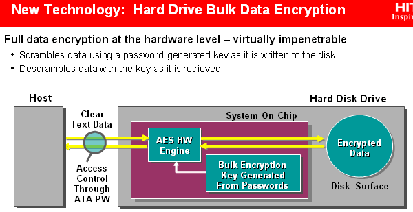 Детали по реализации полностью аппаратной системы кодирования данных Hitachi пока не сообщаются, но подчеркивается, что в отличие от традиционных программных методов защиты/кодирования данных, она не потребляет системных ресурсов и не сказывается на быстродействии дисков. Компания будет использовать алгоритмы Advanced Encryption Standard (AES) — индустриального стандарта для технологий кодирования данных. Опционально диски с Encryption будут присутствовать в обеих сериях мобильных дисков Hitachi, описанных выше. В гибридных дисках кодирование будет защищать и магнитную, и полупроводниковую память диска.