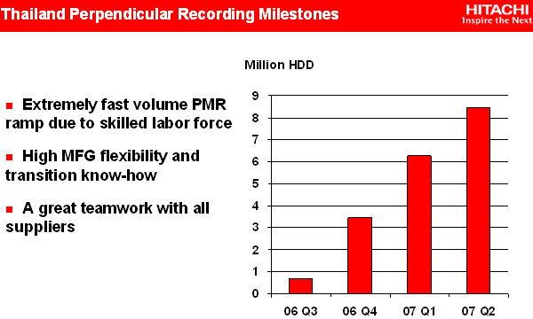Кстати, они производятся на заводе компании в Таиланде, а китайский завод Hitachi, расположенный в Шеньжене, недавно отметил выпуск 50-миллионной магнитной пластины для жестких дисков, из которых уже более 2 миллионов используют PMR.