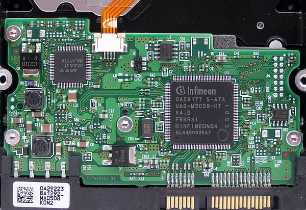 Зато плата контроллера изменилась кардинально. Применение новой микросхемы контроллера производства Infineon (совместная разработка с IBM/Hitachi) позволило не только перейти на использование нового интерфейса, но и заметно сократить площадь платы контроллера — прежние три микросхемы заменила одна — контроллер Infineon (на фото).