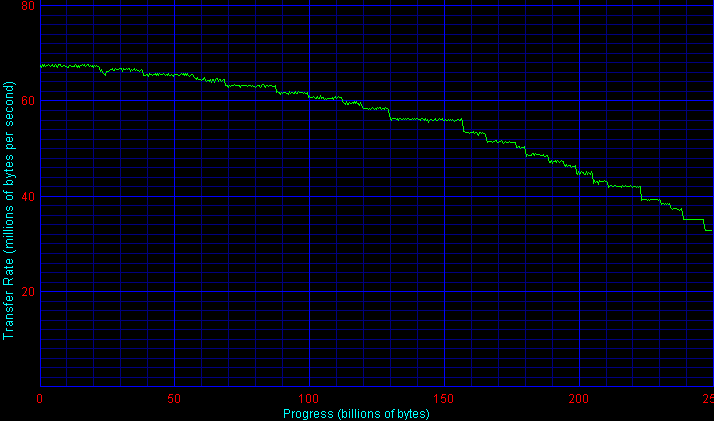 Вывод один — для моделей емкостью 160 Гбайт серии T7K250 Hitachi использует иное форматирование пластин, нежели для старшей модели этой же серии. Впрочем, необходимо также отметить, что данные накопители (вслед за Deskstar 7K80 и многочисленными Travelstar) применяют так называемое адаптивное форматирование, что при определенных условиях видно на графиках скорости линейного чтения в высоком разрешении (см. ниже).