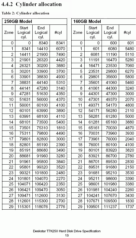 Фактически, линейная плотность записи и плотность дорожек вдоль радиуса увеличилась заметно больше, чем следовало бы из соотношения 125/120=4,2% — они возросли на 7,8% и 5,3% соответственно, что в сумме дает 13,4% разности в Areal density (плотности записи на единицу площади). При этом, как ни странно, изменения Data transfer rates и максимального количества секторов на дорожку (то есть в начале диска) хорошо согласуется c 125/120=4,2%! Таблица распределения цилиндров для этих дисков четко показывает, что в зависимости от емкости модели зоны форматирования и распределение цилиндров по ним существенно различны (то есть даже попытки мысленно «сместить» одно из распределений не приводят к обнаружению сходства в распределениях).