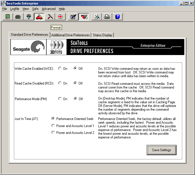 фирменная утилита Seagate Seatools Enterprise, предназначенная для управления параметрами SCSI-накопителей исключительно Seagate, не только прекрасно опознает этот диск (правда, тоже как продукт Compaq), но и позволяет оперировать его настройками прямо как продуктом Seagate, например, изменяя параметры кэширования и Performance Mode (кстати, поставляется этот накопитель HP с отключенным кэшированием записи).