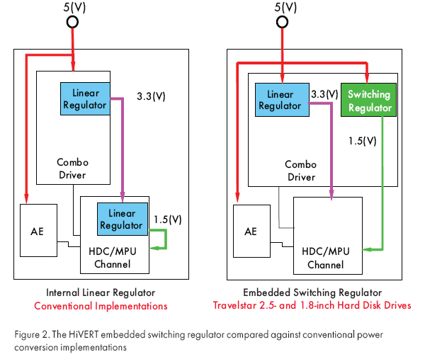 Среди достаточно новых и интересных технологий стоит упомянуть PRML (Partial Response Maximum Likelihood) и две технологии управления питанием:HiVERT и Enhanced ABLE. Первая из них расшифровываемая как Hitachi Voltage Efficiency Regulator Technology и, работая в связке с Enchanced ABLE, позволяет экономить потребляемую мощность без снижения производительности диска. Суть ее в следующем. Если от пятивольтового (+5V) источника питаются только шпиндельный и «соленоидный» (VCM) моторы мобильного накопителя, а также чип предусилителей, то остальная электроника диска может быть запитана от более низких напряжений (например, +3,3 и +1,5 вольт). И если ранее для получения более низких напряжений из пяти вольт использовались простые каскадные линейные стабилизаторы (что требовало немалого тока потребления, на схеме слева), то с HiVERT часть из них заменена более экономичными импульсными стабилизаторами с эффективностью преобразования около 90% (на схеме справа).