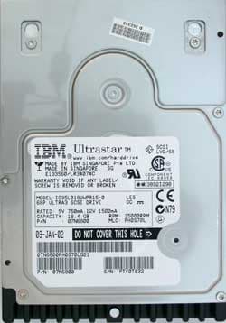 Итак, лирическое отступление закончено, теперь, собственно, о том, что же я тестировал и с чем буду сравнивать. Тестировался 18-гигабайтный диск Ultra160 SCSI из линейки IBM Ultrastar 36Z15 — IC35L018UWPR15. Пластины, как это водится у IBM, «стеклянные» (glass substrate), естественно, поддерживается DFT (Drive Fitness Test), кроме этого, применена технология «парковочной рампы» (load/unload ramp).