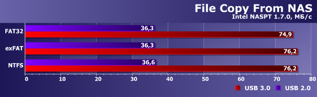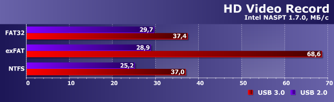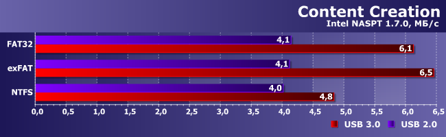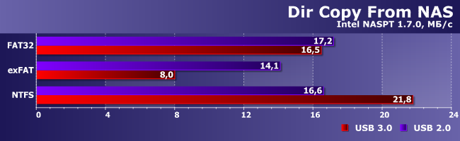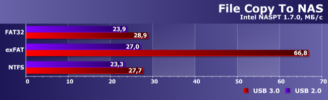 При копировании в обратном направлении NTFS в очередной раз удалось доказать свои преимущества. С другой стороны, отчетливо они видны только при использовании USB 2.0 — на теоретически более быстром интерфейсе производительность заметно падает. Почти до уровня, демонстрируемого exFAT. А вот эта файловая система как раз, существенно наращивает скорость — увеличение пропускной способности смогло в немалой степени скомпенсировать увеличение объема фактически передаваемых данных.