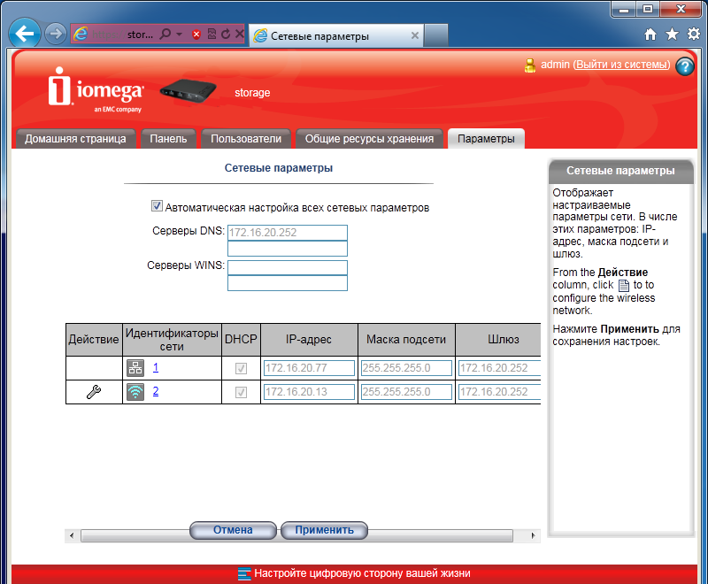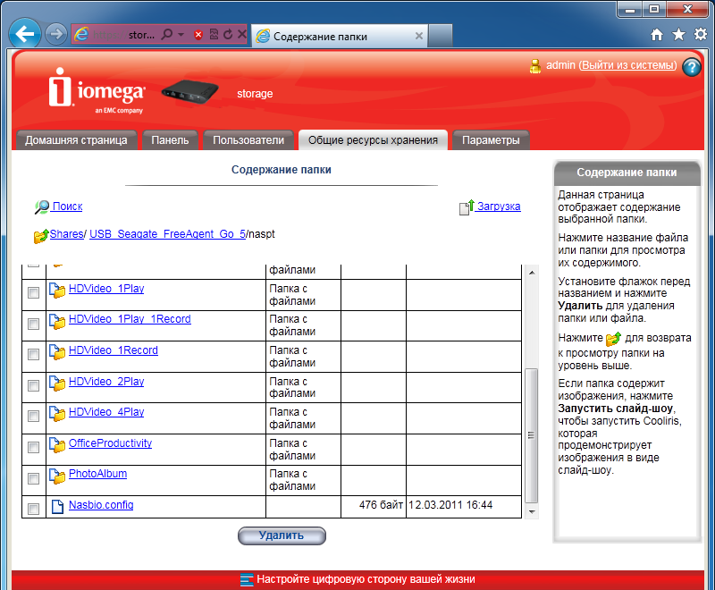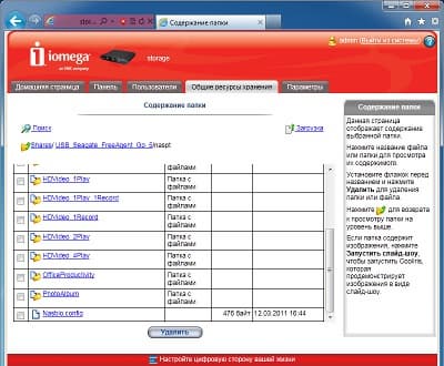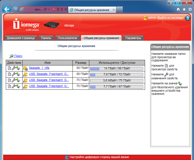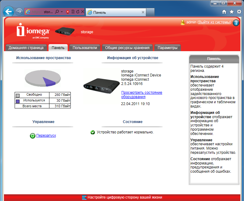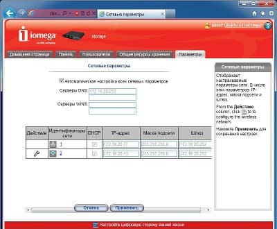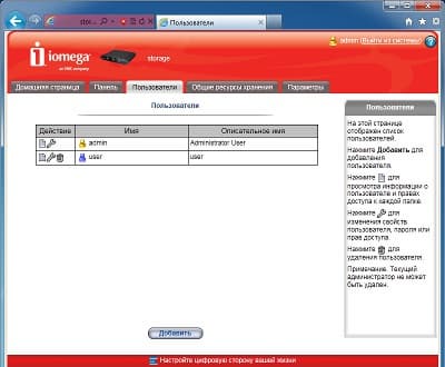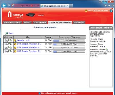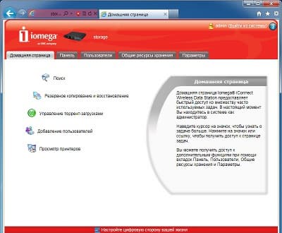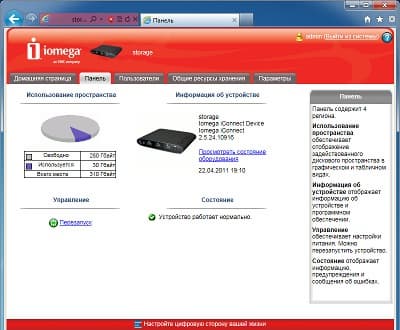 Интерфейс в целом одинаковый с другим описанным ранее устройством Iomega. Начальная установка устройства требует ответа на три простых вопроса: сетевое имя накопителя и описание, адрес электронной почты администратора, настройка часов. После этого пользователь получает доступ к основному web-интерфейсу iConnect.