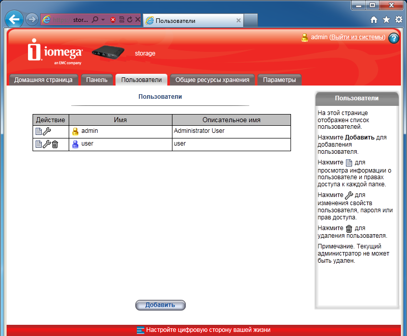 Если вы перешли в режим с контролем доступа, то указать имена и пароли пользователей можно на одноименной странице. Интересно, что при желании можно выдать права администрирование накопителя и обычным пользователям и просмотреть для каждого из них, к каким защищенным папкам у него есть доступ.