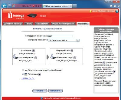 Но при необходимости пользователь может сам запрограммировать нужное число заданий. При этом в качестве источника и получателя могут выступать как локальные диски, так и сетевые ресурсы (SMB/CIFS или rsync). Выбрать нужные данные можно с точностью до директории. Каждое из заданий можно связать с кнопкой на корпусе iConnect или установить для него расписание работы. Получается, что даже без установки специального программного обеспечения на клиентские компьютеры, можно обеспечить создание копий документов с них только с использованием рассматриваемой модели сетевого накопителя.