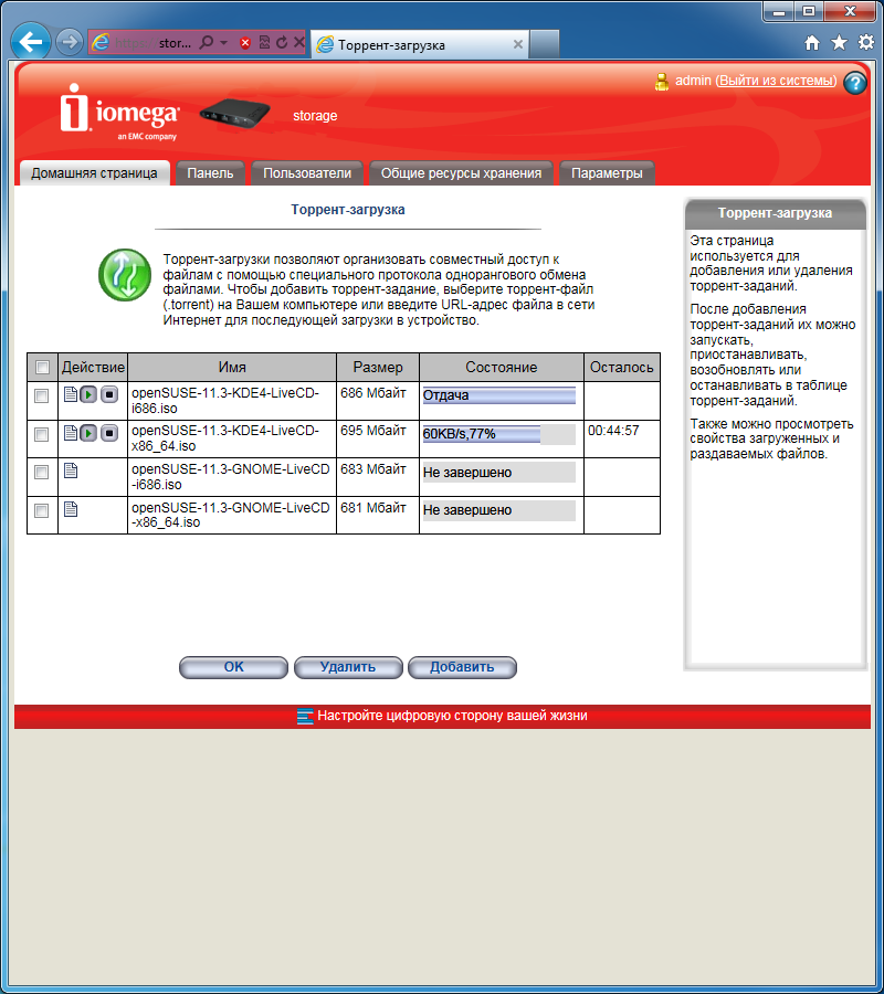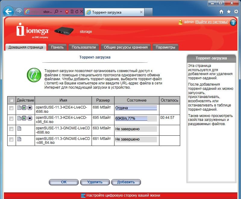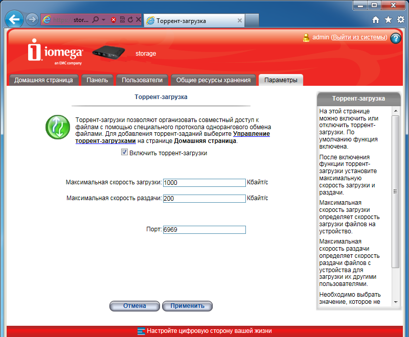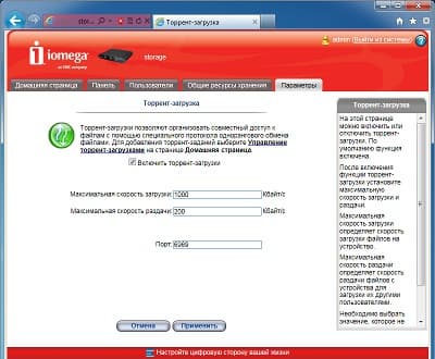 Удивительно, что в такой простой модели даже реализован торрент-клиент. Конечно, его возможности в некотором смысле минимальны, однако он вполне работоспособен, что мы и проверили на практике. Из настроек есть выбор директории работы, ограничение скоростей загрузки и отдачи, изменение порта. Правда вот для последней опции есть ограничение в виде диапазона 6881-6999, что не всегда удобно. Загружаться может только одно задание одновременно, но предусмотрена очередь. При добавлении нового файла, устройство сначала занимает для него место и только потом начинает загрузку. Для крупных заданий этот процесс может быть достаточно долгим. Раздача происходит и во время загрузки, и после нее. Остановить процесс пользователь должен самостоятельно.